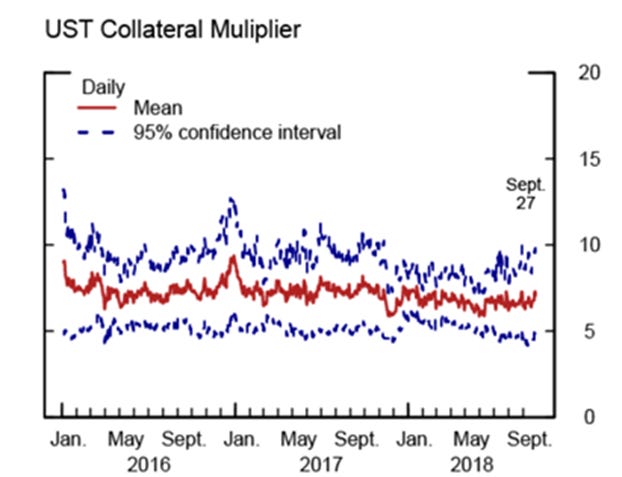 I usually refer to the global, bilateral portion of the repo market (as opposed to the US, tri-party portion of the repo market) in my discussions of the repo market. The global repo market is a bilateral repo market and is consequently relatively opaque. More importantly, the global bilateral repo market is also where collateral rehypothecation is not limited by regulations and therefore is a more accurate representation of the market clearing price for collateral.4 This stands in stark contrast with the relatively more understood US tri-party repo market, which is only about $1-2 trillion in size (and for which we now have detailed statistics).5