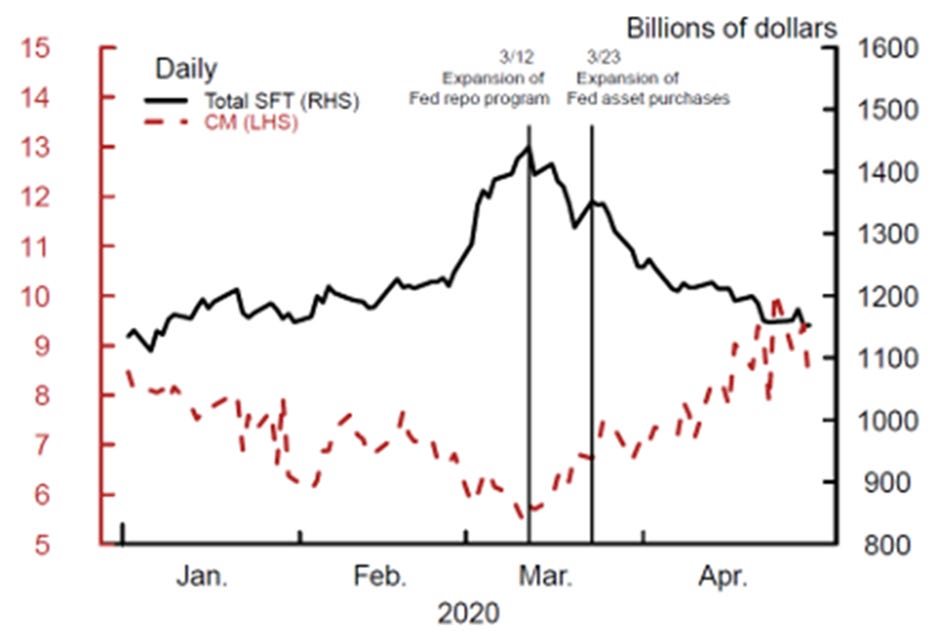 Dealer repledging/rehypothecation is driven by risk perceptions – it is only natural that when dealers’ perceptions of risk begin to rise, dealers respond by limiting reuse due to counterparty risk. This has already been demonstrated via an approximately 50% drop in collateral velocity after Lehman Brothers.22 Indeed, that is also what we saw in March 2020 – an extreme example of collateral shortage in the repo market.23